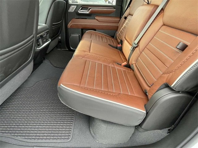 12 Speakers, 120-Volt Bed Mounted Power Outlet, 120-Volt Instrument Panel Power Outlet, 16-Way Power Driver Seat Adjuster with Lumbar, 16-Way Power Passenger Seat Adjuster with Lumbar, 2 Charge-Only Rear USB Ports, 2 Charge/Data USB Ports Inside Center Console, 2 USB Ports, 2-Speed Active Transfer Case, 220-Amp Alternator, 3.42 Axle Ratio, 4-Wheel Disc Brakes, ABS brakes, Air Conditioning, Alloy wheels, AM/FM radio: SiriusXM with 360L, Apple CarPlay/Android Auto, Auto High-beam Headlights, Auto-dimming door mirrors, Auto-dimming Rear-View mirror, Automatic Emergency Braking, Automatic temperature control, Bed View Camera with Two Trailer Camera Provisions, Block heater, Body Color Wheel Arch Moldings, Bose Premium Series 12-Speaker System, Brake assist, Buckle to Drive, Bumpers: body-color, Compass, Deep-Tinted Glass, Delay-off headlights, Driver door bin, Driver Memory, Driver vanity mirror, Dual front impact airbags, Dual front side impact airbags, Dual Heavy-Duty 70 Amp Battery, Electric Rear-Window Defogger, Electronic Stability Control, Emergency communication system: OnStar, Floor-Mounted Center Console, Following Distance Indicator, Forward Collision Alert, Front anti-roll bar, Front Bucket Seats, Front Center Armrest, Front dual zone A/C, Front fog lights, Front License Plate Kit, Front Pedestrian Braking, Front Rain-Sensing Wipers, Front reading lights, Front wheel independent suspension, Full Grain Leather Seat Trim, Fully automatic headlights, Garage door transmitter, Genuine wood dashboard insert, Genuine wood door panel insert, Gooseneck/5th Wheel Prep Package, HD Surround Vision, Heads-Up Display, Heated 2nd Row Outboard Seats, Heated door mirrors, Heated Driver and Front Outboard Passenger Seats, Heated front seats, Heated rear seats, Heated steering wheel, Hill Descent Control, Hitch Guidance with Hitch View, Illuminated entry, in-Vehicle Trailering System App, Inside Rearview Auo-Dimming Rear Camera Mirror, IntelliBeam Automatic High Beam on/Off, Keyless Open and Start, Lane Departure Warning System, Leather steering wheel, LED Cargo Area Lighting, LED Smoked Amber Roof Marker Lamps, Low tire pressure warning, Manual Tilt-Wheel/Telescoping Steering Column, Memory seat, Multicolor 15 Diagonal Head-Up Display, Occupant sensing airbag, Off-Road Suspension, OnStar Services Capable, Outside temperature display, Overhead airbag, Overhead console, Panic alarm, Passenger door bin, Passenger vanity mirror, Pickup Box, Power door mirrors, Power driver seat, Power Front Passenger Windows with Express Up/Down, Power moonroof, Power passenger seat, Power Sliding Rear Window with Defogger, Power steering, Power Sunroof, Power windows, Preferred Equipment Group 5SB, Premium audio system: Premium GMC Infotainment System, Push Button Start, Radio: AM/FM Stereo with Premium GMC Infotainment System, Rain sensing wipers, Rear Cross Traffic Alert, Rear reading lights, Rear seat center armrest, Rear step bumper, Rear Wheelhouse Liners, Rear window defroster, Remote keyless entry, Remote Vehicle Starter System, Safety Alert Seat, Security system, Signature Denali Ultimate Grille in Vadar Chrome, SiriusXM with 360L Trial Subscription, Speed control, Speed-sensing steering, Split folding rear seat, Spray-on Pickup Bedliner with GMC Logo, Steering Wheel Audio Controls, Steering wheel mounted audio controls, Tachometer, Technology Package, Telescoping steering wheel, Tilt steering wheel, Traction control, Trailer Cam Provisions and Trailer Viewing Software, Trailer Side Blind Zone Alert, Trailer Tire Pressure Monitor Sensors, Trip computer, Turn signal indicator mirrors, Ultrasonic Front and Rear Park Assist, Unauthorized Entry Theft-Deterrent System, Universal Home Remote, Variably intermittent wipers, Ventilated Driver and Front P Price includes: $500