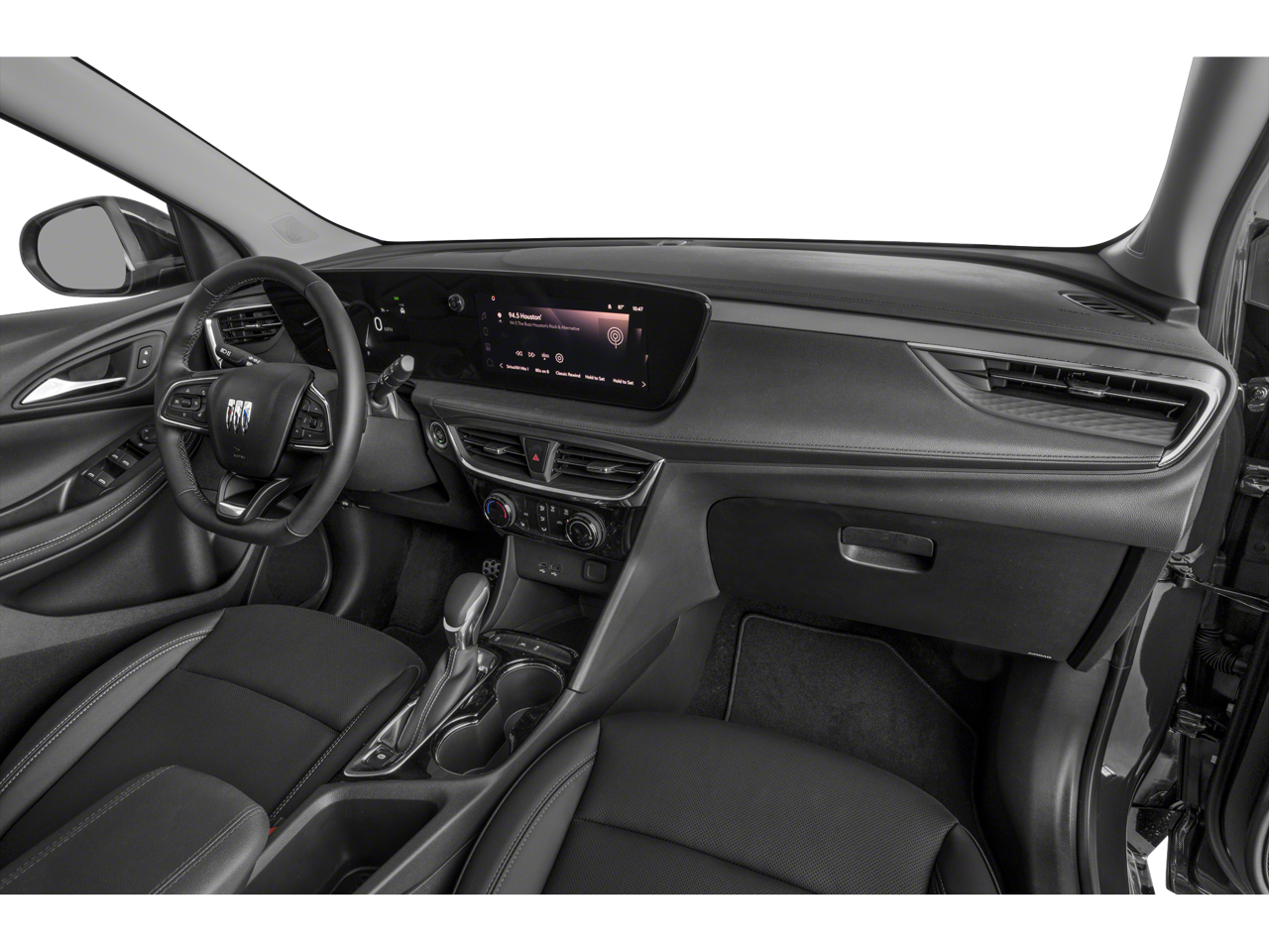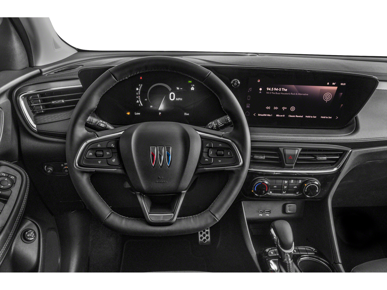 2 USB Ports (1 Type-A, 1 Type-C), 4-Way Manual Passenger Seat Adjuster, 4-Wheel Disc Brakes, 5.45 Final Drive Axle Ratio, 6 Speakers, 6-Way Manual Driver Seat Adjuster, ABS brakes, Air Conditioning, All-Weather Floor Liners (LPO), Alloy wheels, AM/FM radio: SiriusXM, Auto High-beam Headlights, Automatic temperature control, Brake assist, Bumpers: body-color, Compass, Delay-off headlights, Driver door bin, Driver vanity mirror, Dual front impact airbags, Dual front side impact airbags, Electronic Stability Control, Emergency communication system: OnStar and Buick connected services capable, Enhanced Performance 6-Speaker System, Front anti-roll bar, Front Bucket Seats, Front Center Armrest, Front License Plate Bracket, Front reading lights, Front wheel independent suspension, Fully automatic headlights, Heated door mirrors, Illuminated entry, Knee airbag, Leatherette Seat Trim, Low tire pressure warning, Occupant sensing airbag, Outside temperature display, Overhead airbag, Overhead console, Panic alarm, Passenger door bin, Passenger vanity mirror, Power door mirrors, Power steering, Power windows, Preferred Equipment Group 1SD, Radio data system, Radio: Audio System w/AM/FM, Rear reading lights, Rear side impact airbag, Rear window defroster, Rear window wiper, Remote keyless entry, Ride & Handling Suspension, Security system, SiriusXM, Speed control, Speed-sensing steering, Split folding rear seat, Spoiler, Sport steering wheel, Steering wheel mounted audio controls, Tachometer, Telescoping steering wheel, Tilt steering wheel, Traction control, Trip computer, Variably intermittent wipers, Wheels: 18 Gloss Black Aluminum, Wireless Apple CarPlay/Wireless Android Auto.